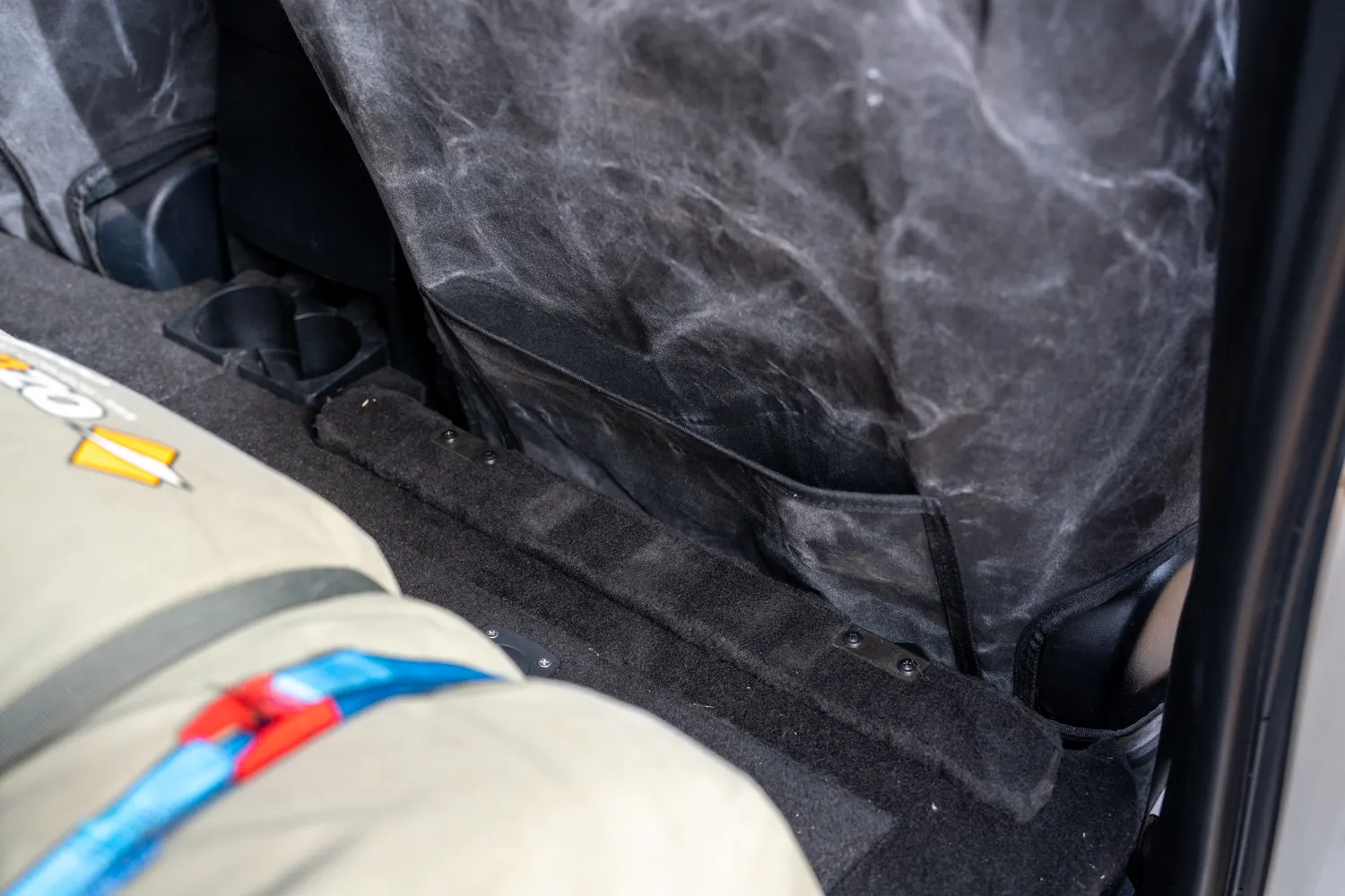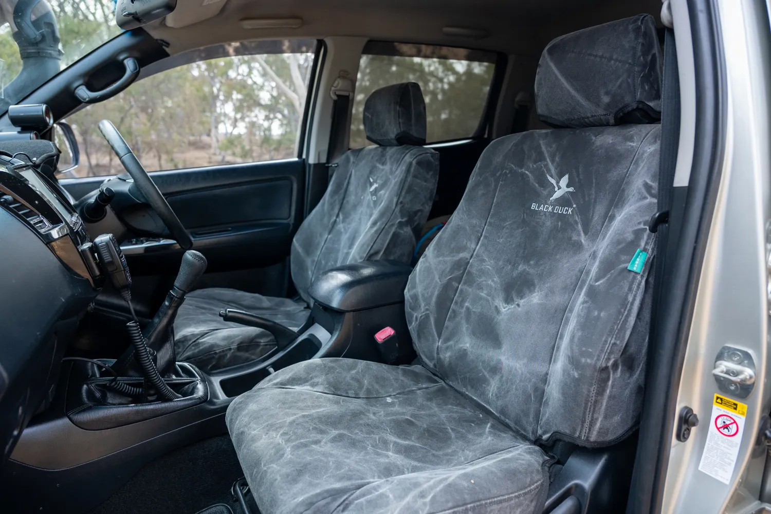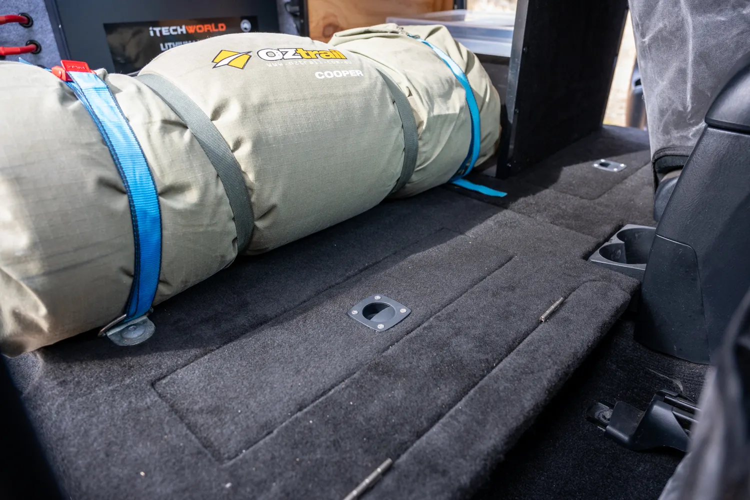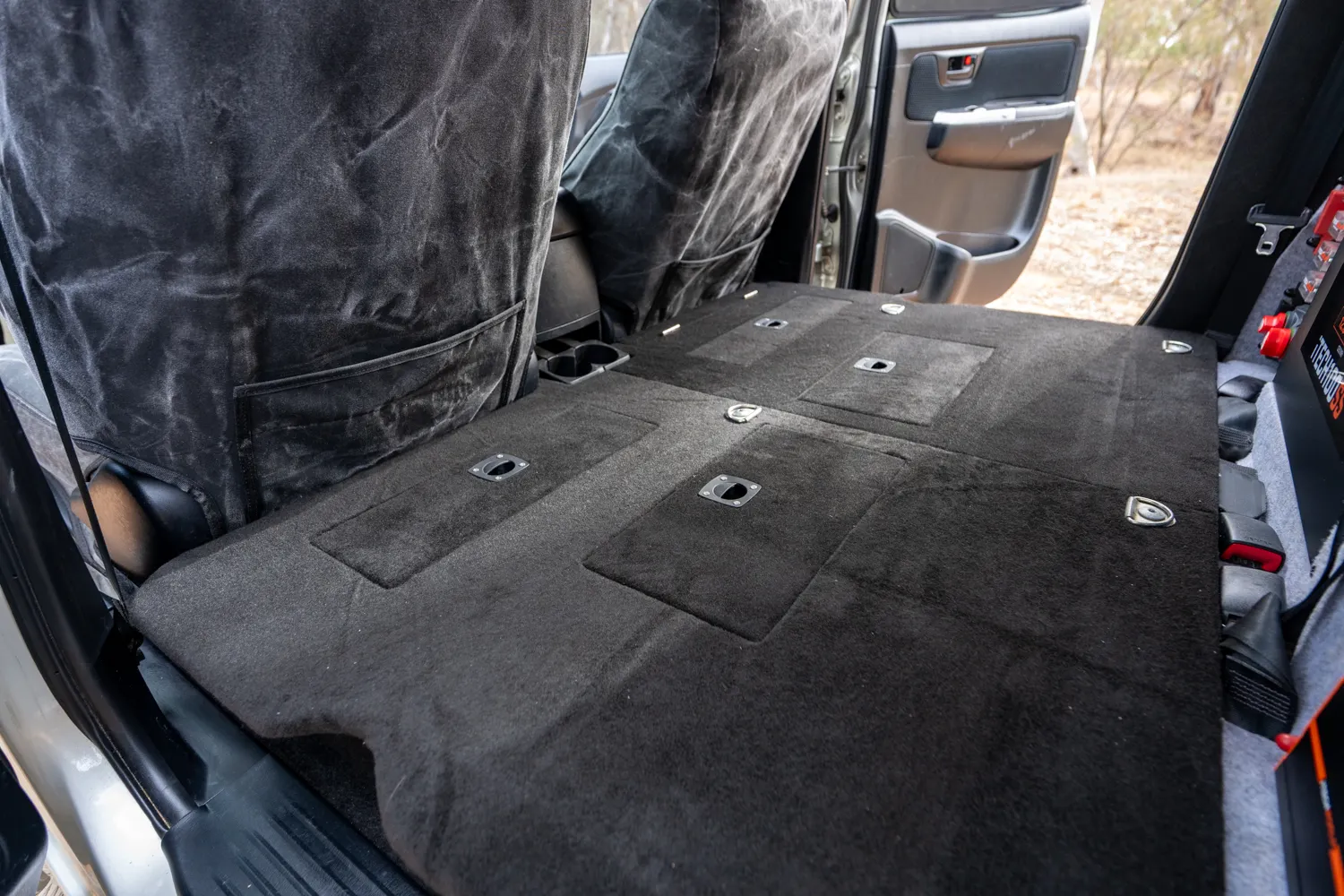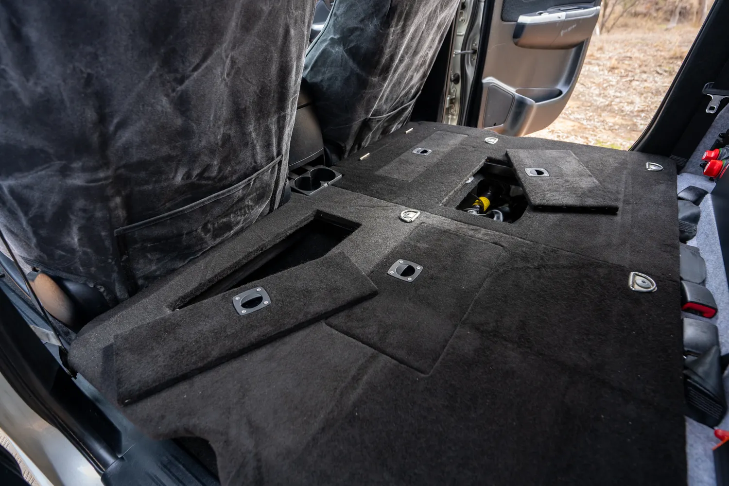 Please note: The rear seats can be reinstalled in under 15 minutes. The false floor is secured using six bolts and can be removed as a complete unit, making it quick and easy to convert the space. This setup was custom-designed for camping trips—maximising practicality while still allowing for a seamless return to the original seating layout. The rear seats are also protected with durable black Duck car seat covers, and the floors can be fitted with Sandgrabba floor mats for extra protection and easy cleaning.