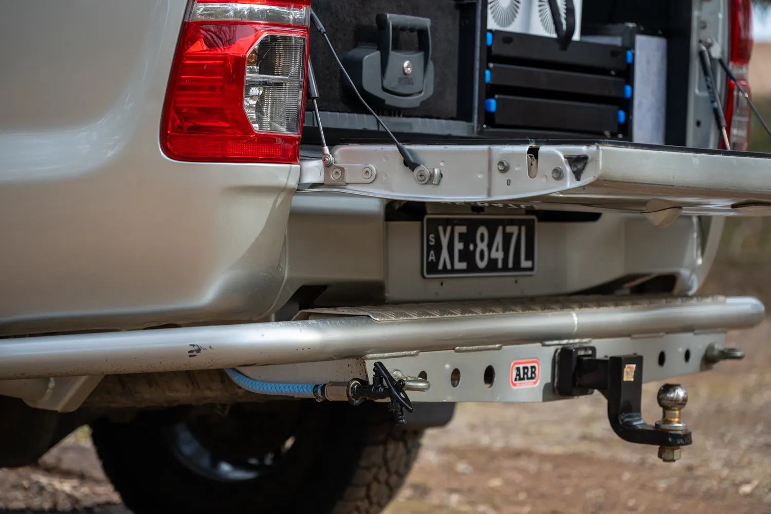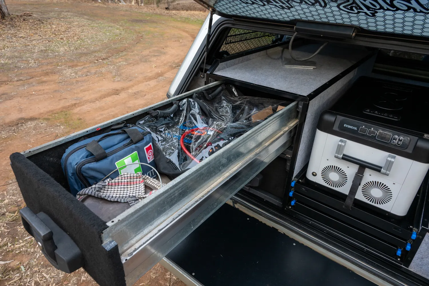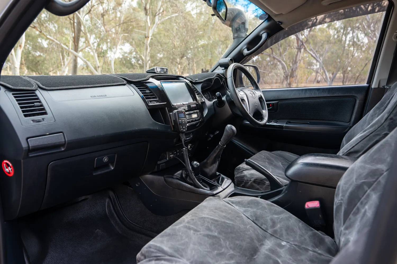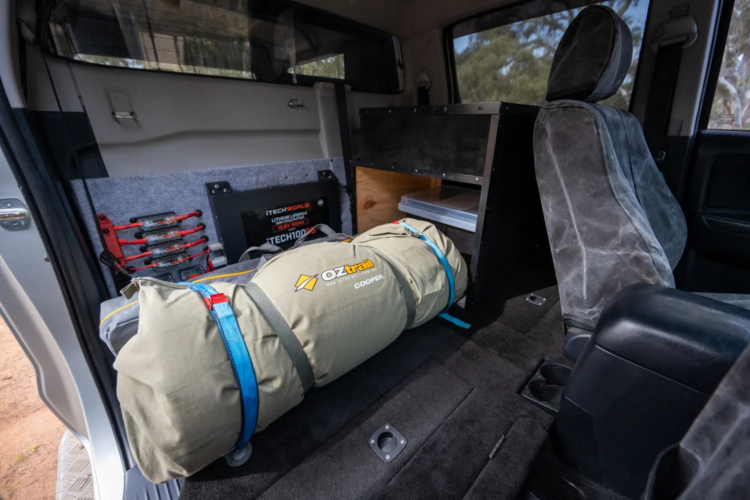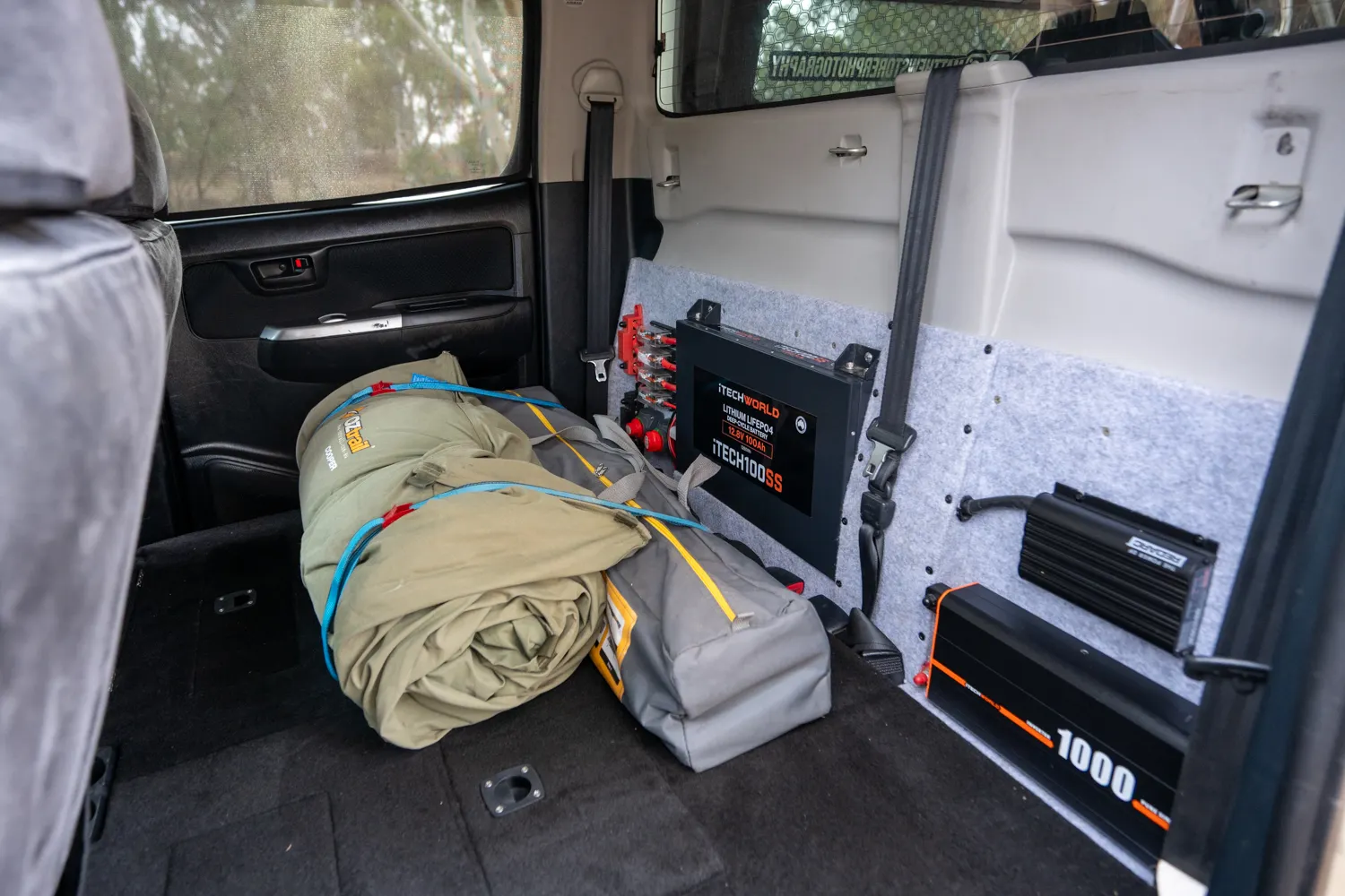 I’ve had the rear seats modified so they can fold forward, which most Hilux models don’t allow. This makes it super easy to access the 12V gear, like checking a fuse or flicking off one of the master switches.
