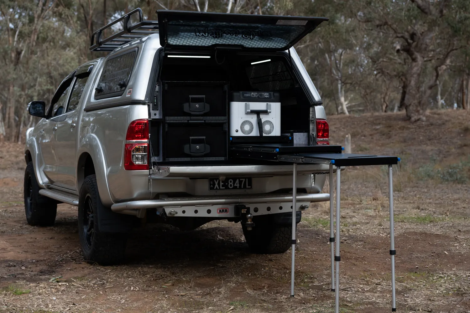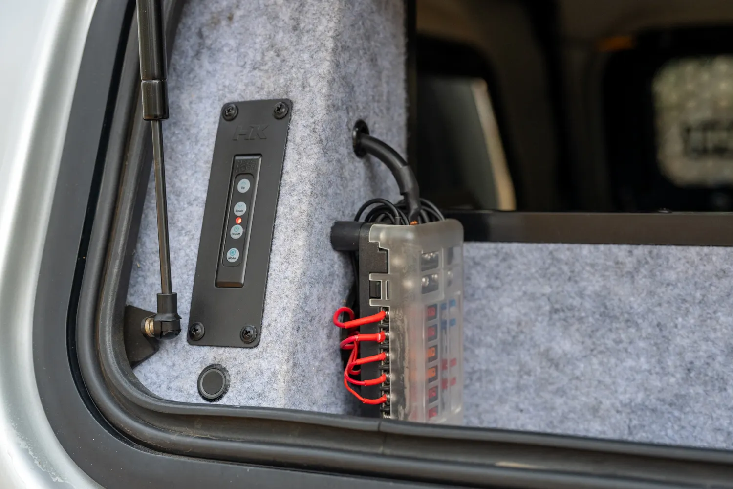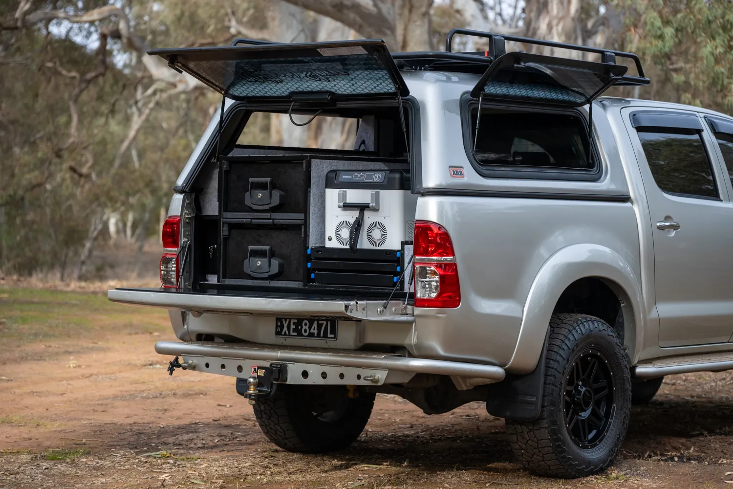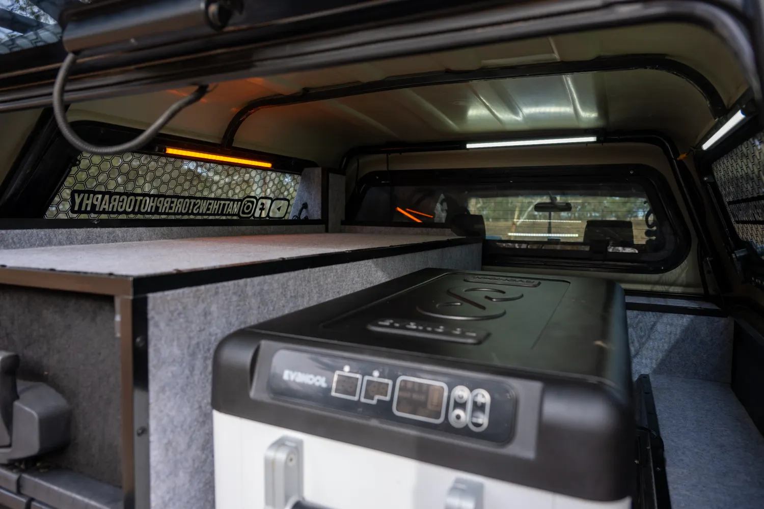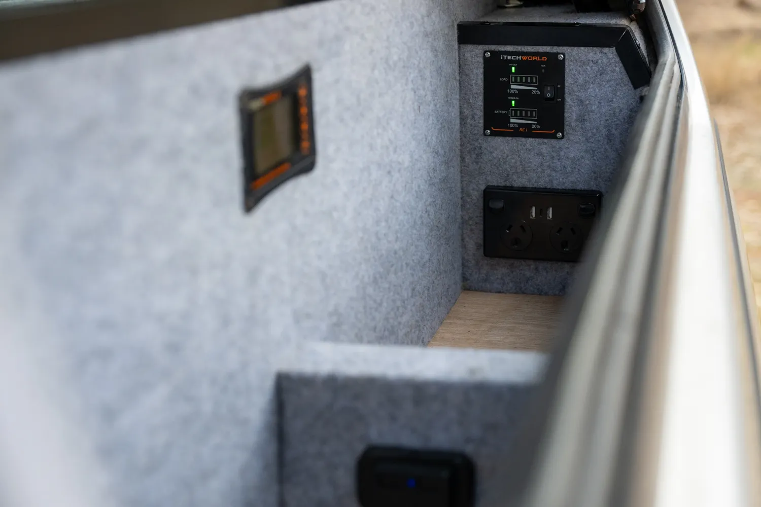 The 12V setup in this Hilux was custom-built by me with practicality and ease of use in mind. It’s all neatly integrated into the vehicle and works perfectly whether you’re running the rear seats or the full camping setup.