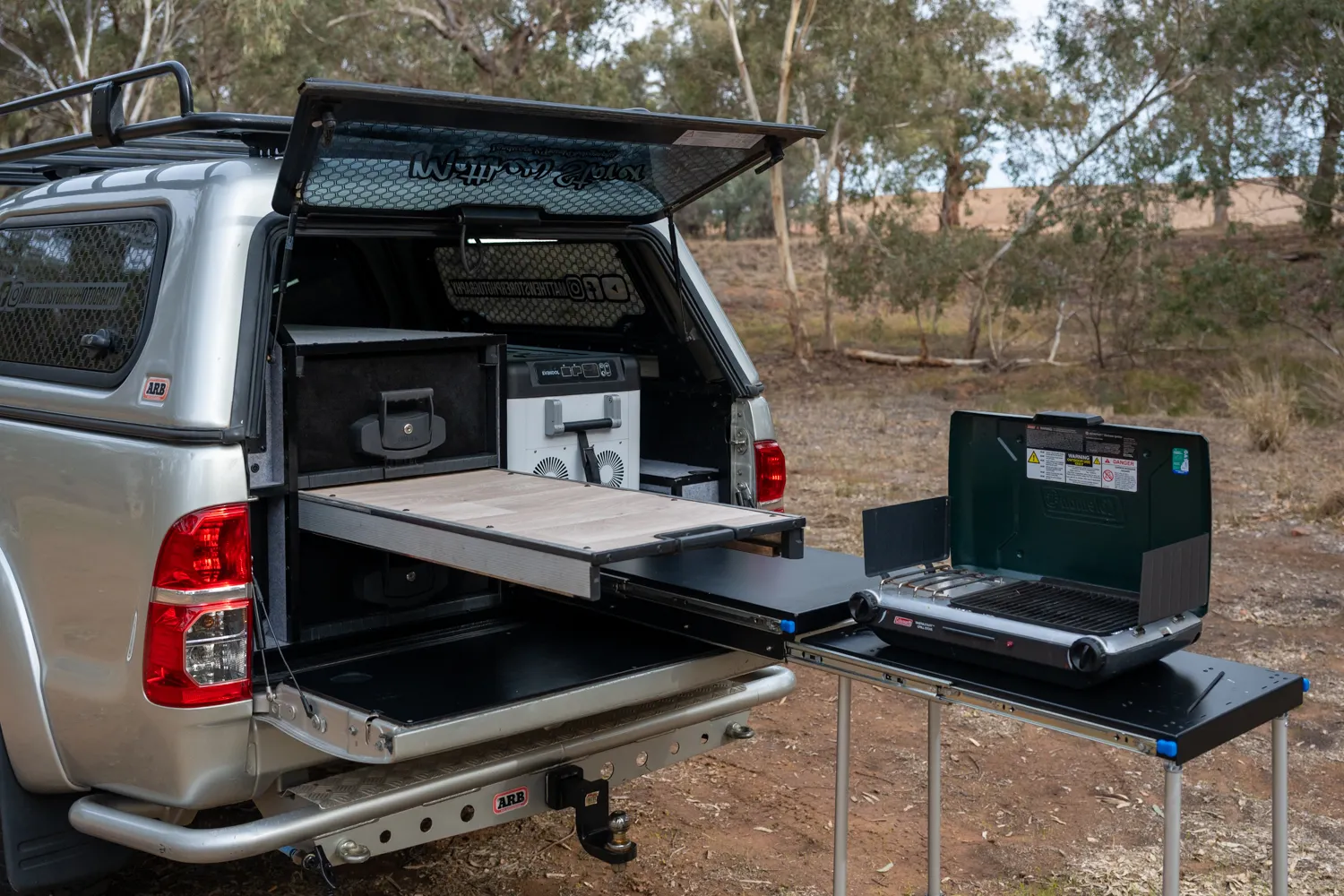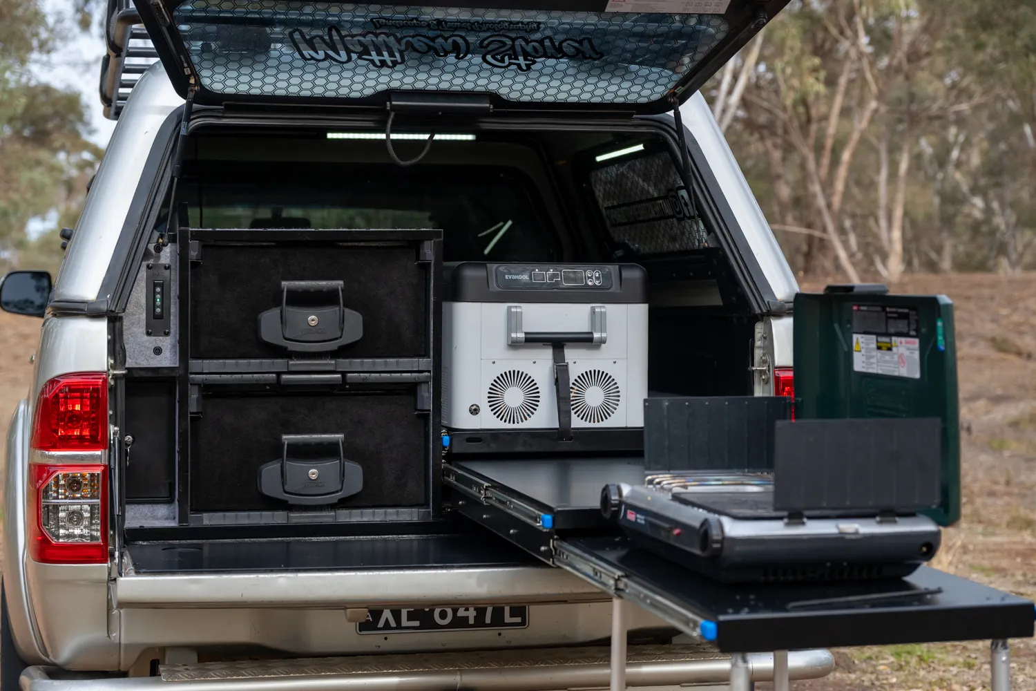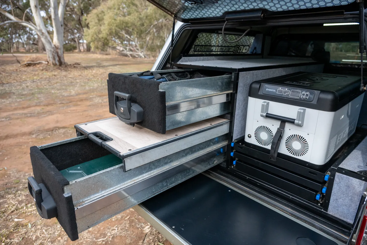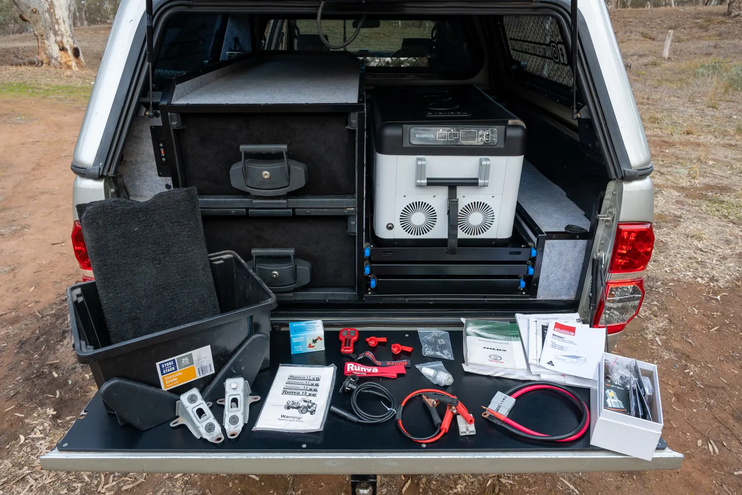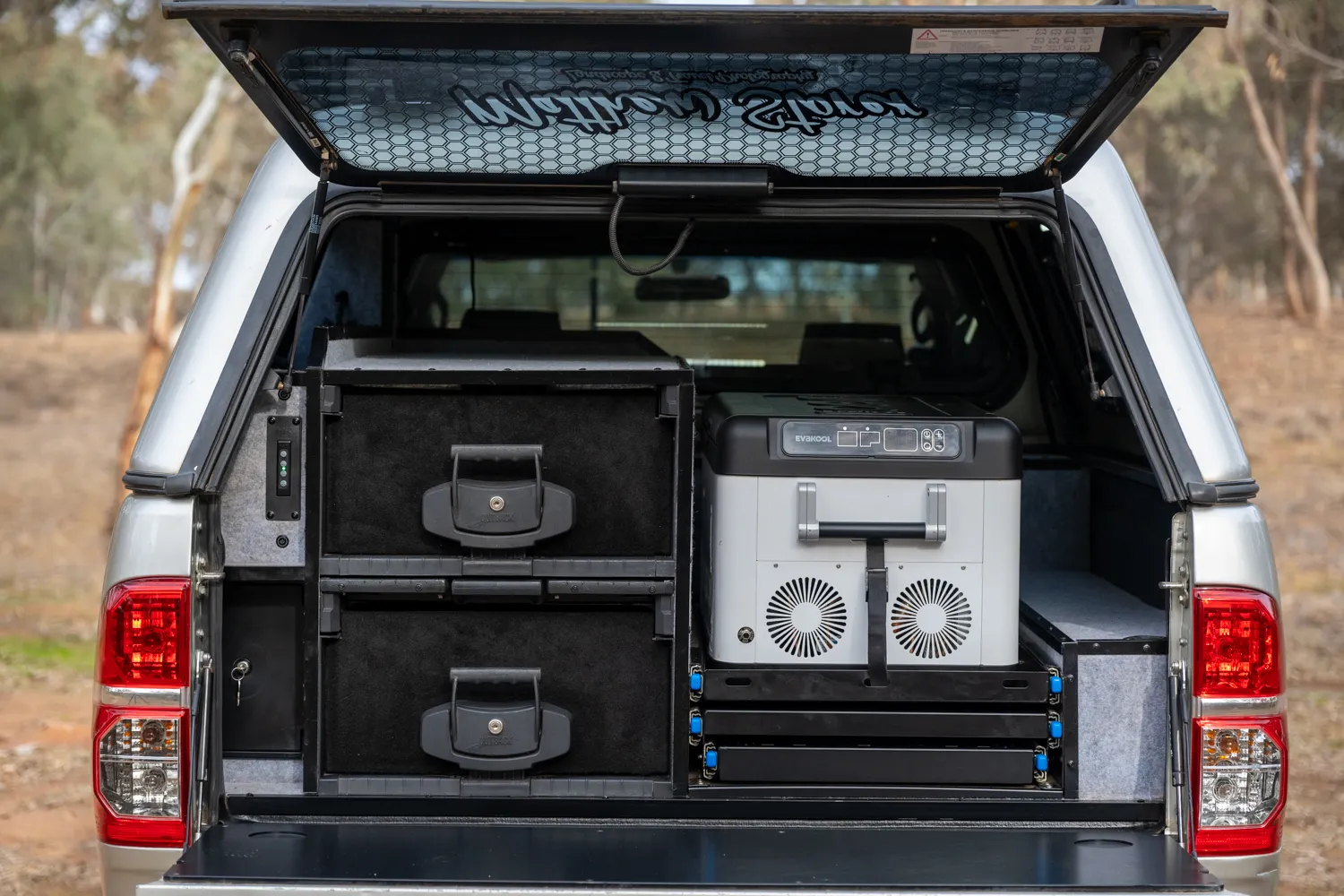 The 12V setup in this Hilux was custom-built by me with practicality and ease of use in mind. It’s all neatly integrated into the vehicle and works perfectly whether you’re running the rear seats or the full camping setup.