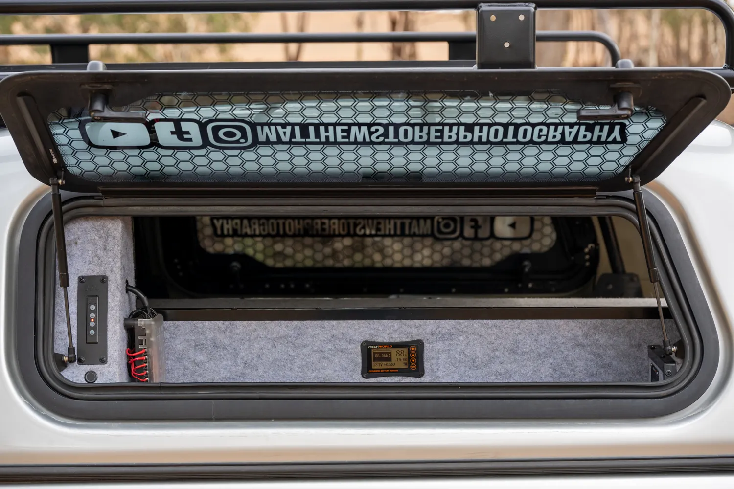 The custom 12V system runs like a dream—powering fridges, camera gear, and electronics completely off-grid with barely any need for backup charging. The rear setup is versatile, switching between a full camping layout and back to standard seating in under 15 minutes. Everything has been thought through, from storage space to lighting and workflow, making it not only functional but genuinely enjoyable to live out of on the road.